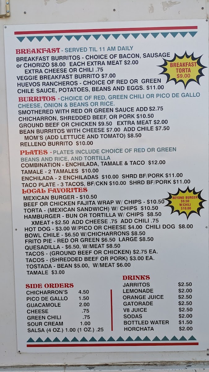From a reviewer’s perspective, the menu at Mary Janes Home Cooking, located at 616 Paseo Del Pueblo Sur in Taos, offers a satisfying snapshot of comforting Southwestern and Mexican-inspired home cooking, bringing together hearty portions, familiar flavors, and flexible combinations. The Burritos section stands out for its versatility, featuring options like the Veggie Breakfast Burrito and Huevos Rancheros - choice of red or green chile sauce, complemented by classic fillings such as potatoes, beans, eggs, cheese, onion, beans or rice, and the option to be smothered in red or green sauce with extra cheese or chili added for extra indulgence. Moving to the Plates, diners can enjoy well-rounded meals that include a choice of red or green beans, rice, and tortilla, with comforting combinations such as the Combination - Enchilada, Tamale & Taco, Tamale - 2 Tamales, or Enchilada - 2 Enchiladas with shredded beef or pork, all reflecting traditional flavors prepared in a straightforward, satisfying style. The Local Favorites category reinforces the restaurant’s casual, welcoming identity, offering crowd-pleasers like the Mexican Burger, Beef or Chicken Fajita Wrap w/ Chips, Torta (Mexican Sandwich) w/ Chips, and the adaptable Hamburger - bun or tortilla w/ chips, with options to add extra meat and cheese for heartier appetites. To round out the meal, Side Orders such as Chicharron’s and Pico de Gallo provide crunchy or fresh accents, while the Drinks selection keeps things simple and refreshing with Jarritos, Lemonade, and Orange Juice. Overall, the menu feels cohesive and honest, emphasizing comfort, customization, and traditional combinations, making Mary Janes Home Cooking a reliable stop for anyone seeking filling, flavorful dishes rooted in local Southwestern and Mexican culinary traditions.